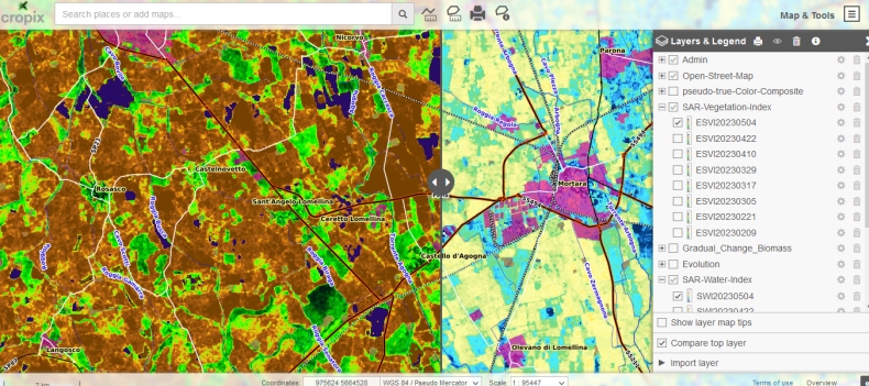 In northern Italy is the biggest rice cultivation area of Europe. The ESVI allows to monitor the irrigation regime and the growth of biomass in the rice paddies.